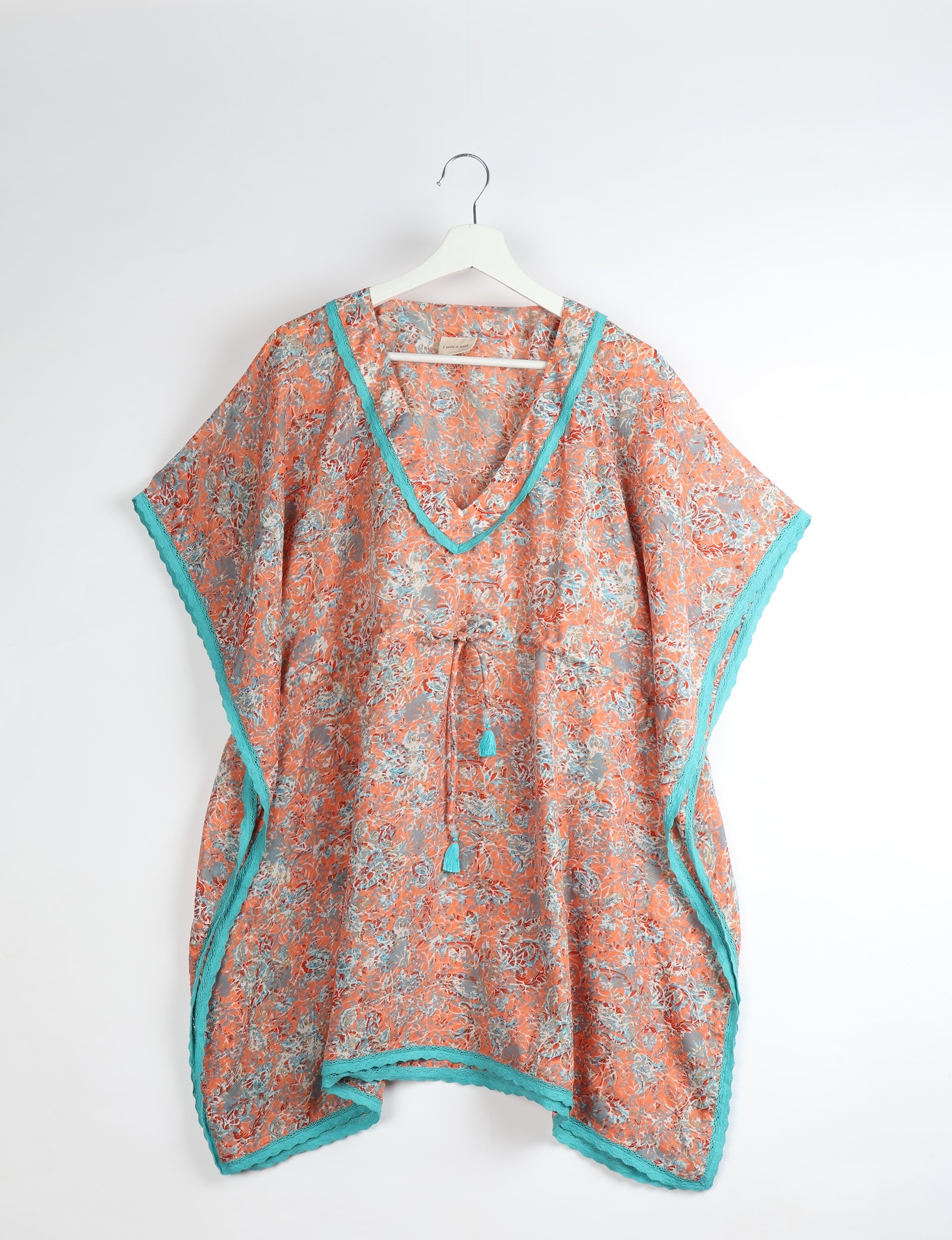 Thigh length relaxed-fit kaftan with a V neckline, extended sleeves, and an adjustable drawstring at the waist with beaded tassels. Contrasting lace trimmings over the neckline, sides and hemline.