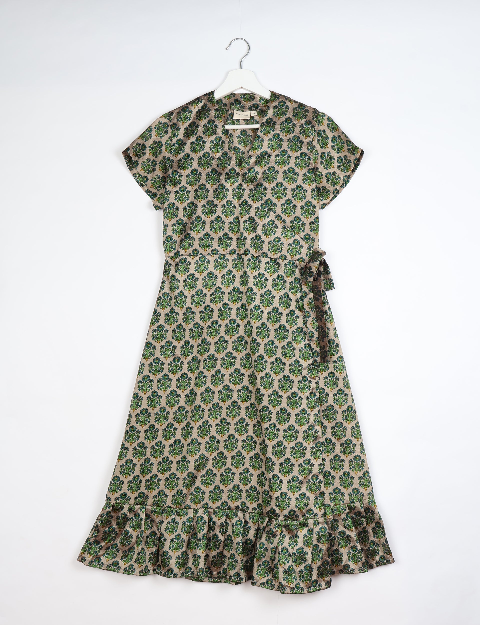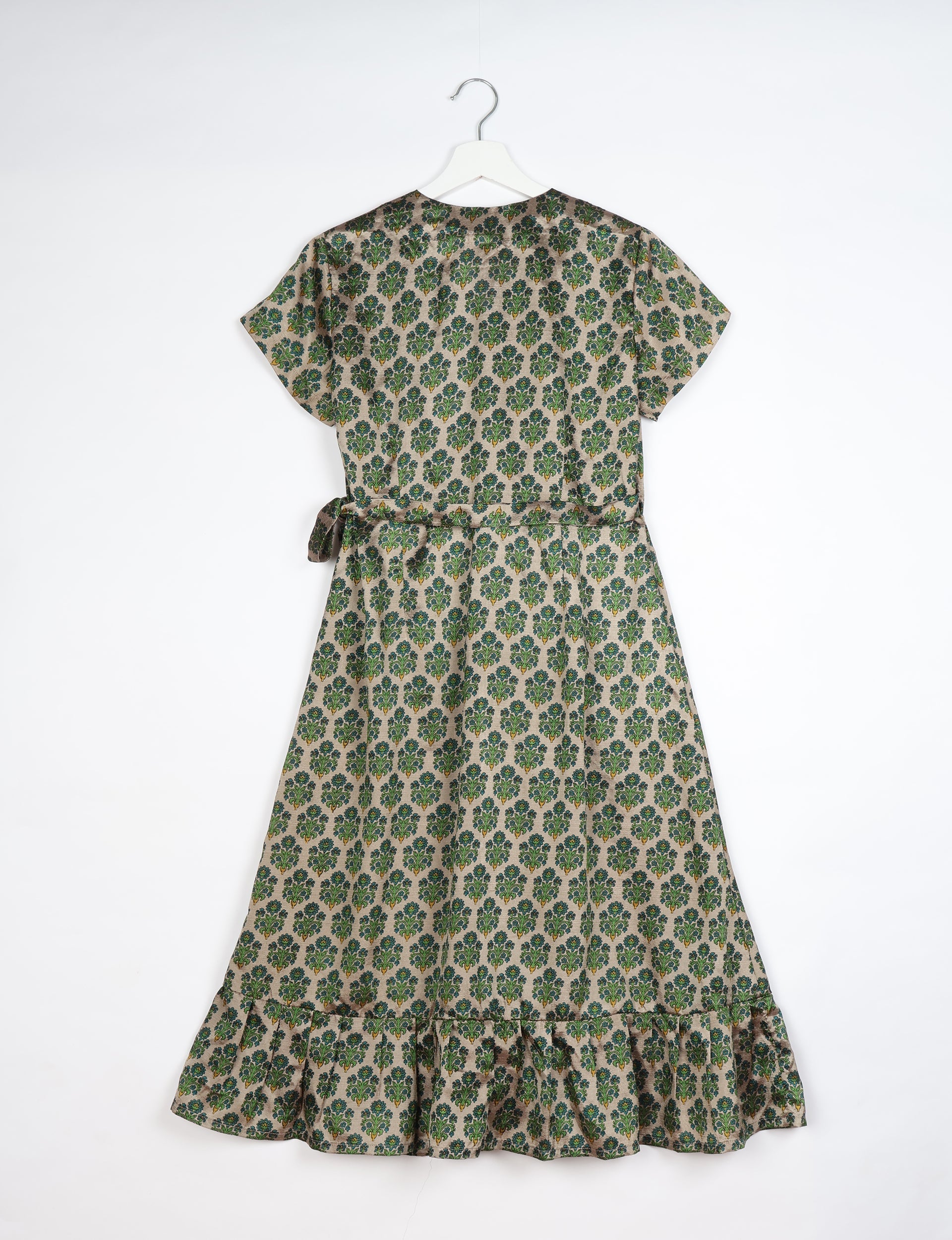 This is a midi-length wrap dress with short cap sleeves. The bodice is shaped with a side wrap construction that ties externally with a self-fabric belt. The skirt flares into an A-line silhouette. The hem is finished with a gathered frill tier to add volume and movement.