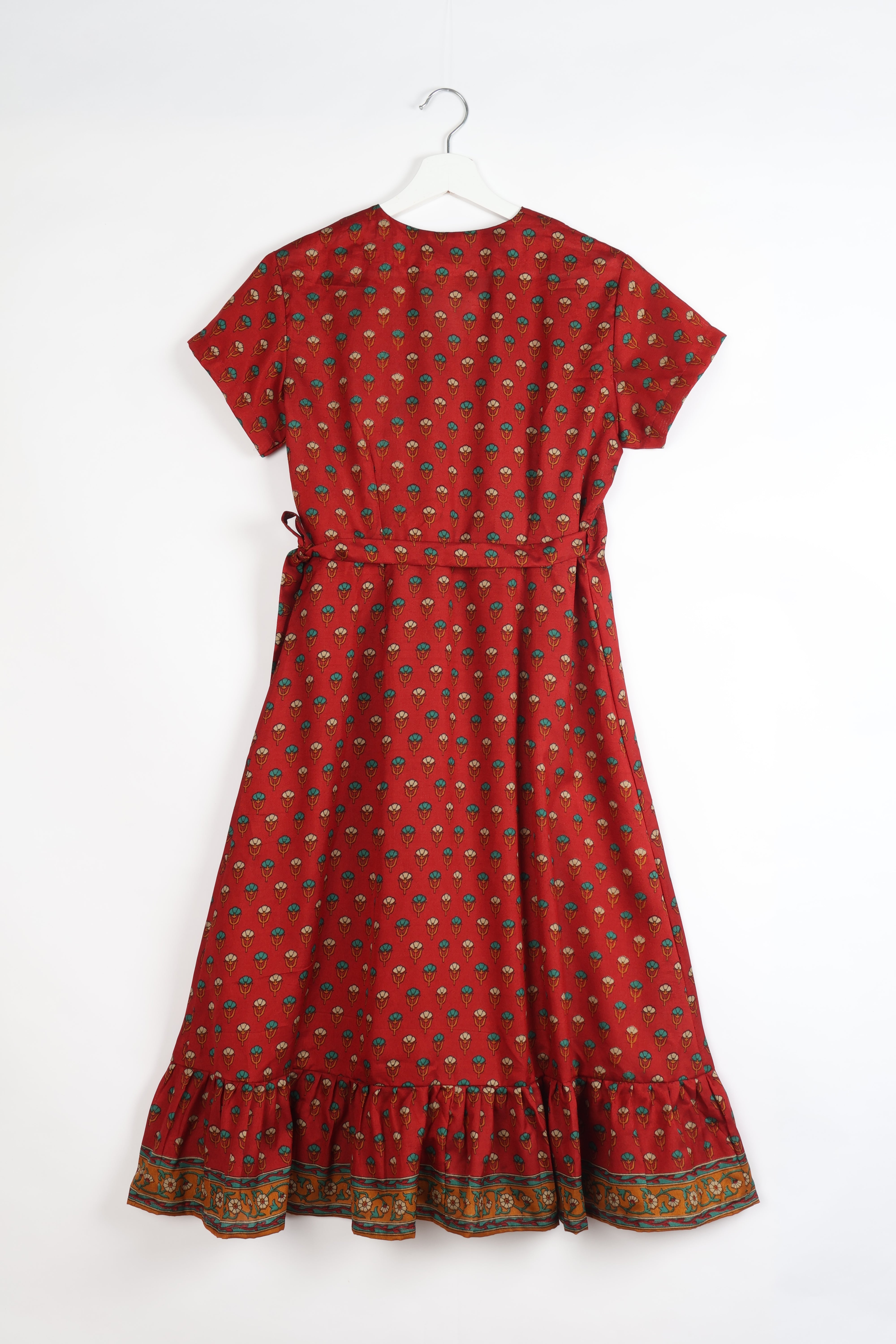 This is a midi-length wrap dress with short cap sleeves. The bodice is shaped with a side wrap construction that ties externally with a self-fabric belt. The skirt flares into an A-line silhouette. The hem is finished with a gathered frill tier to add volume and movement.