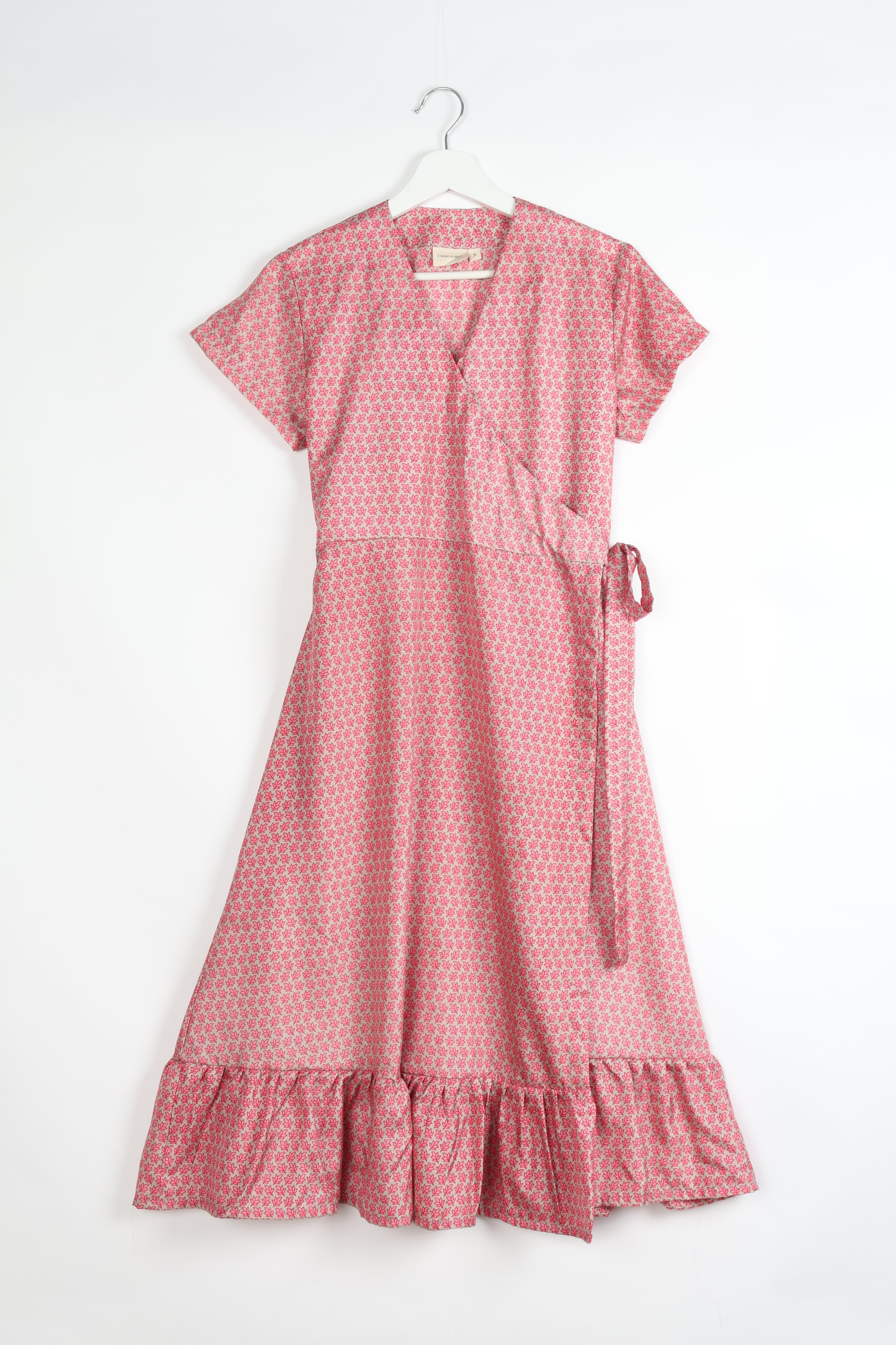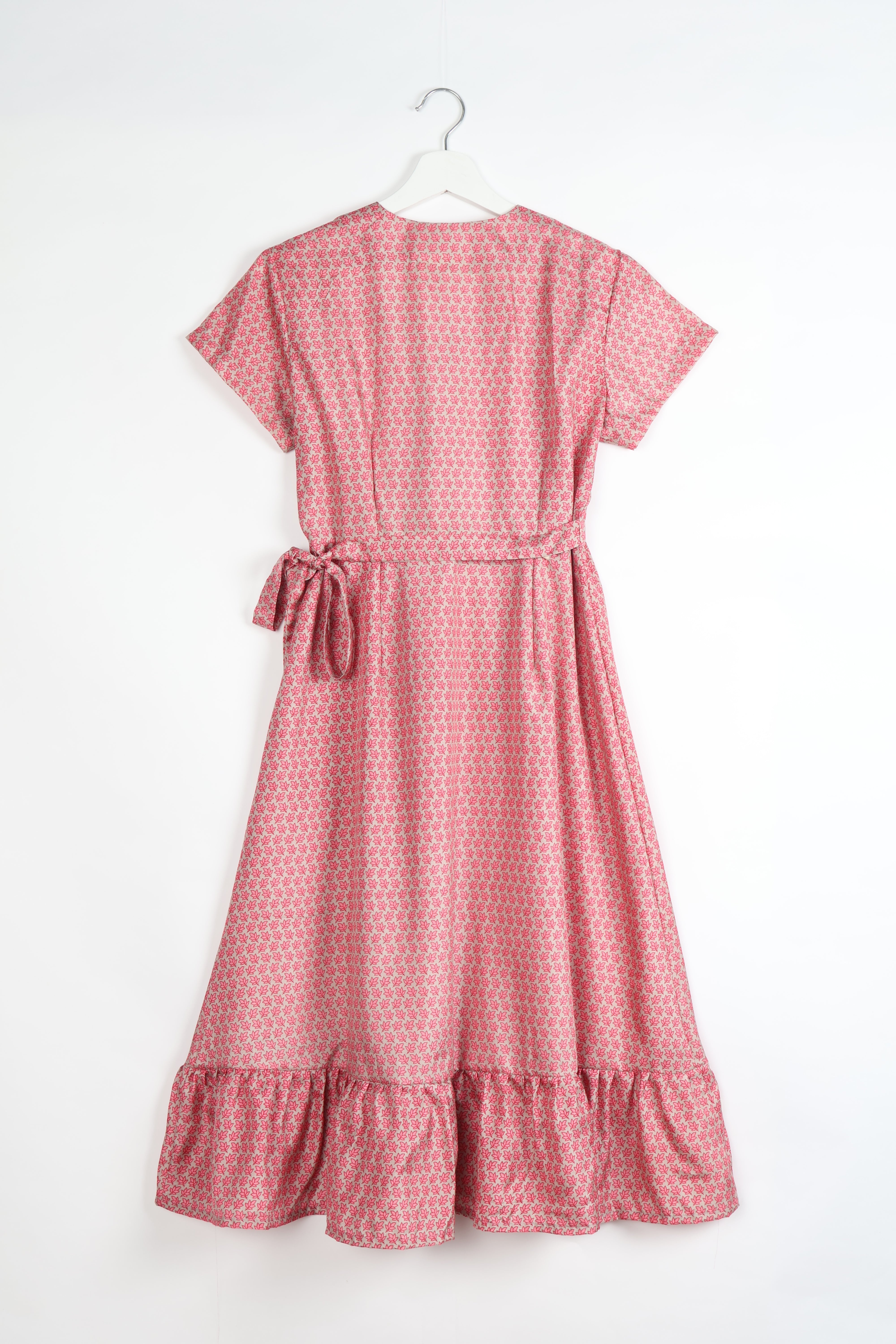 This is a midi-length wrap dress with short cap sleeves. The bodice is shaped with a side wrap construction that ties externally with a self-fabric belt. The skirt flares into an A-line silhouette. The hem is finished with a gathered frill tier to add volume and movement.