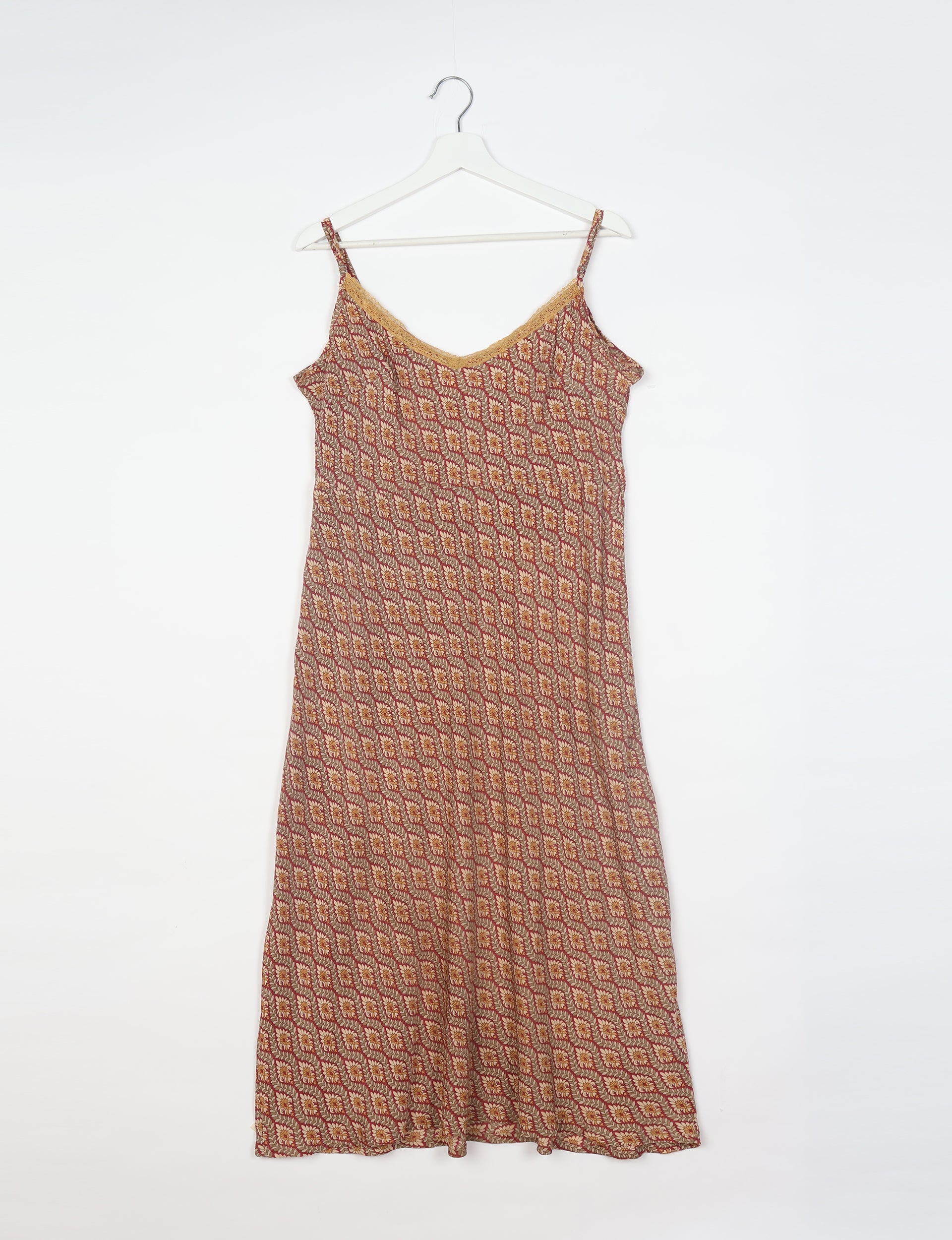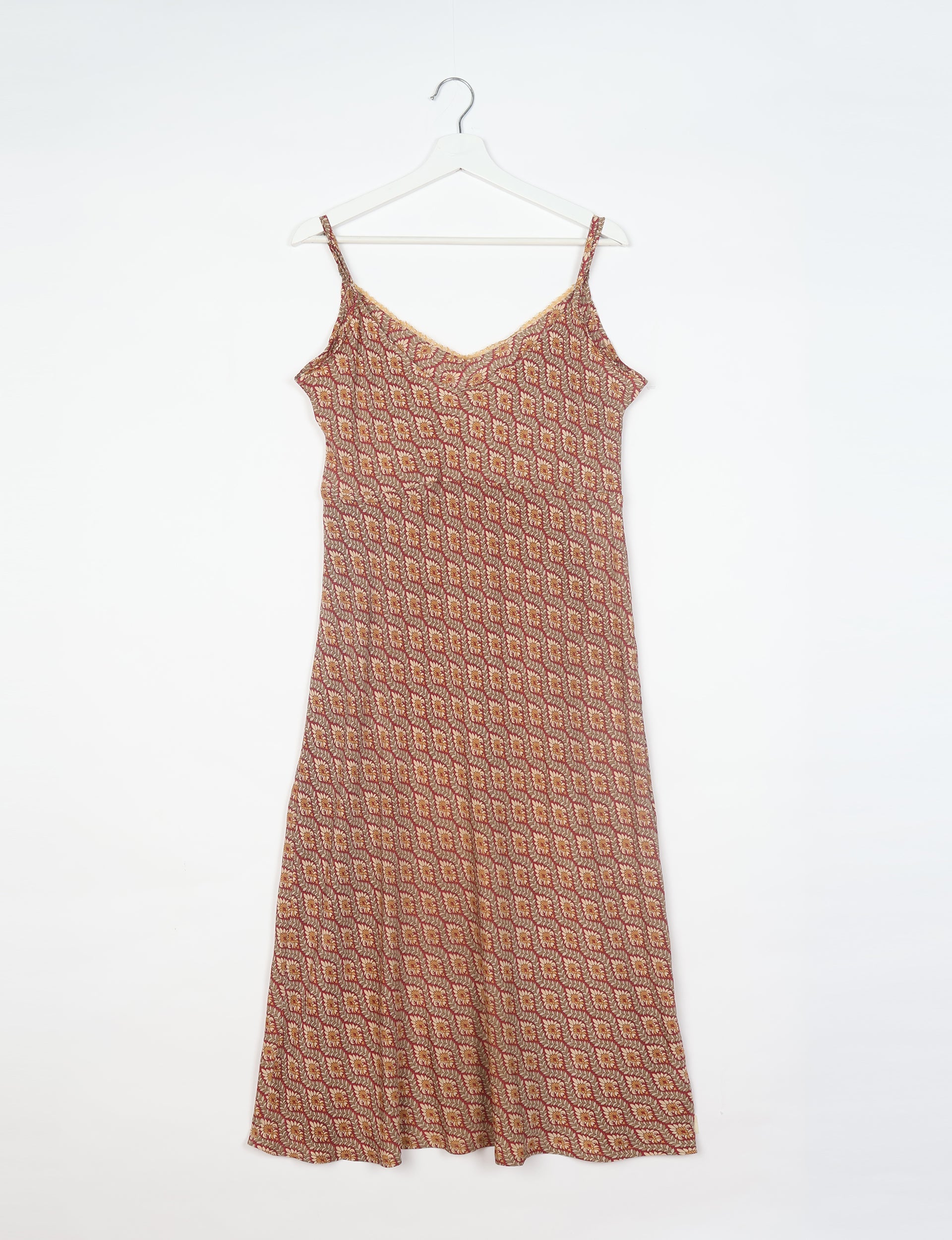 This is a midi-length slip dress constructed with an A line silhouette and adjustable spaghetti straps. The neckline is shaped with a soft V at the front and lace detailing.