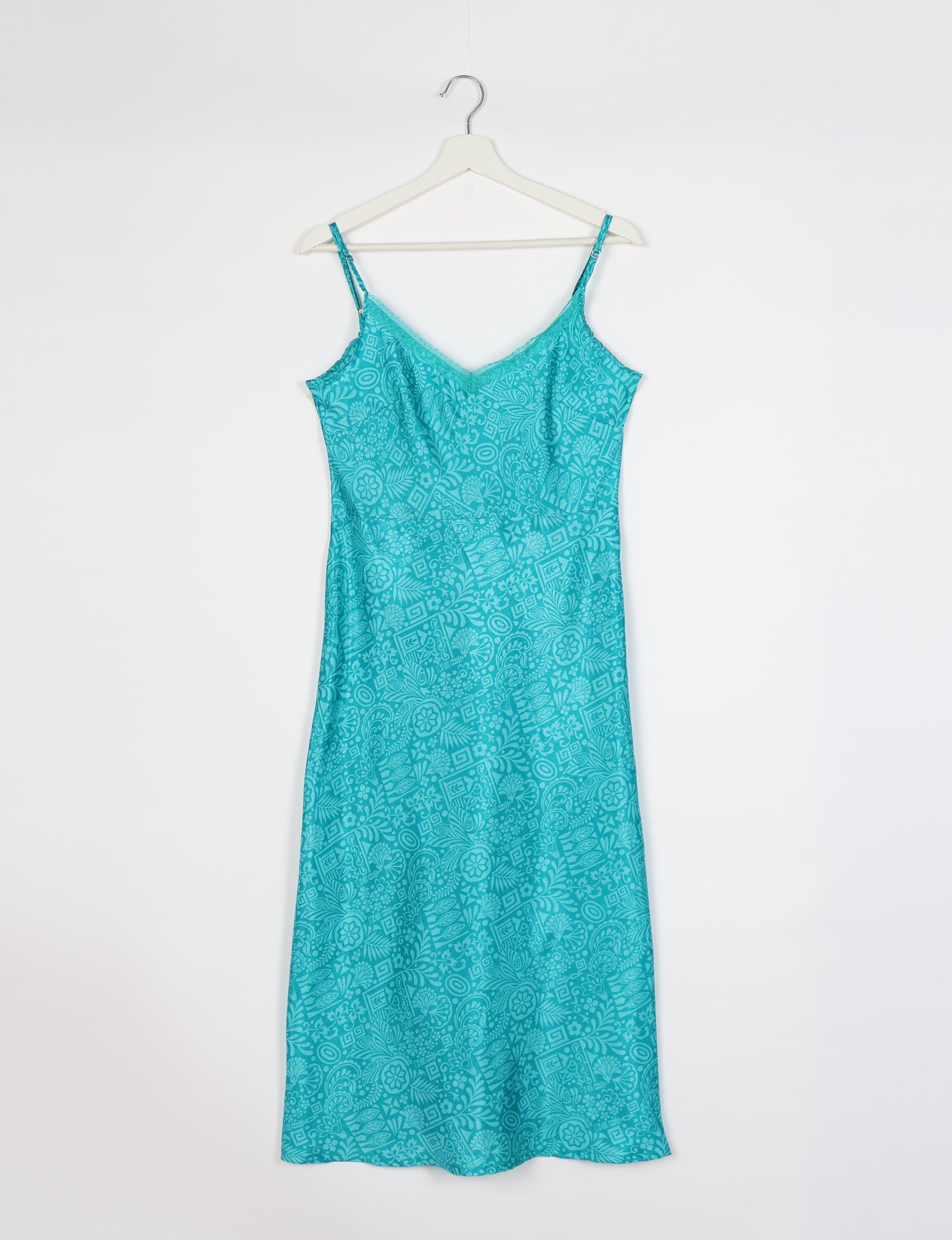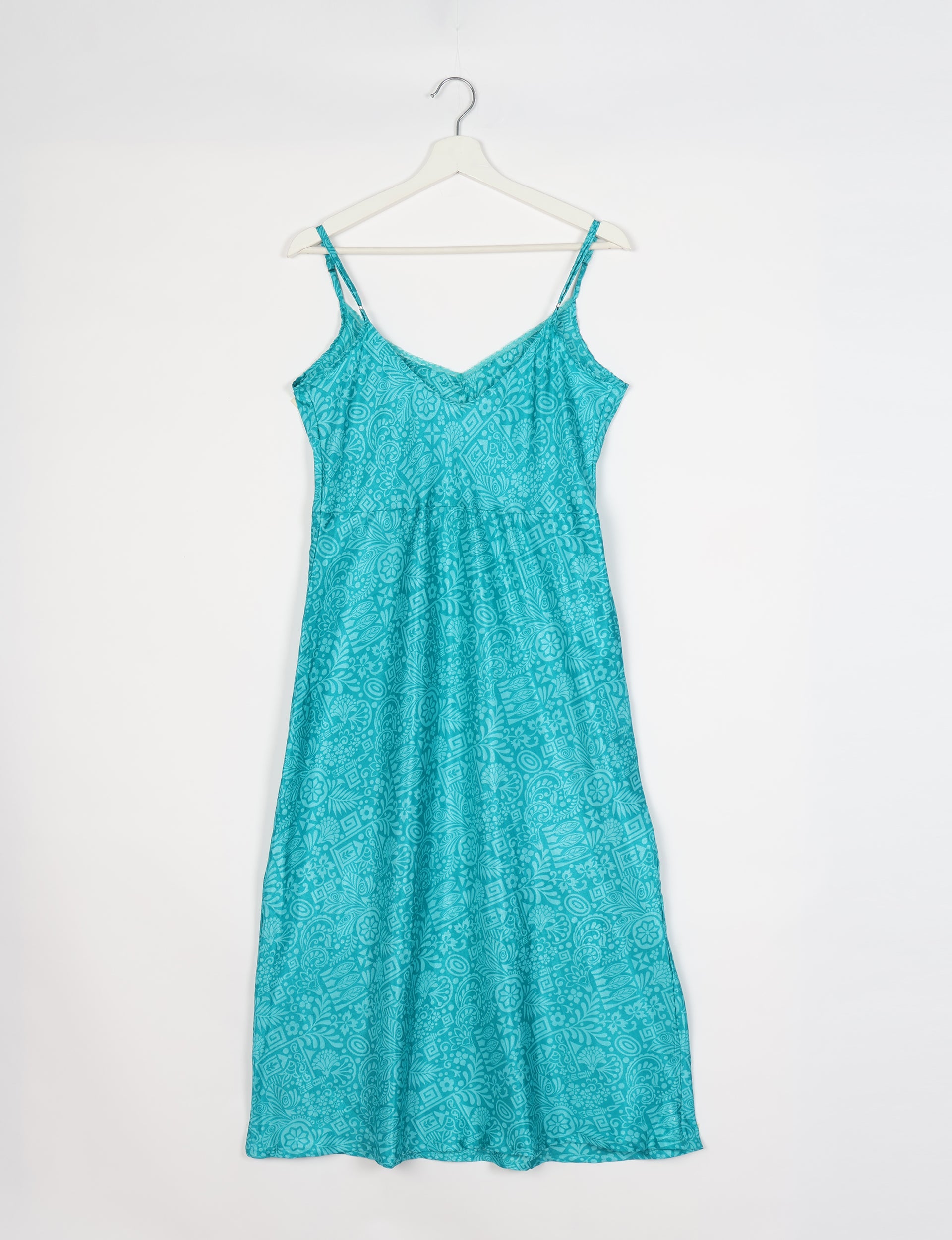 This is a midi-length slip dress constructed with an A line silhouette and adjustable spaghetti straps. The neckline is shaped with a soft V at the front and lace detailing.