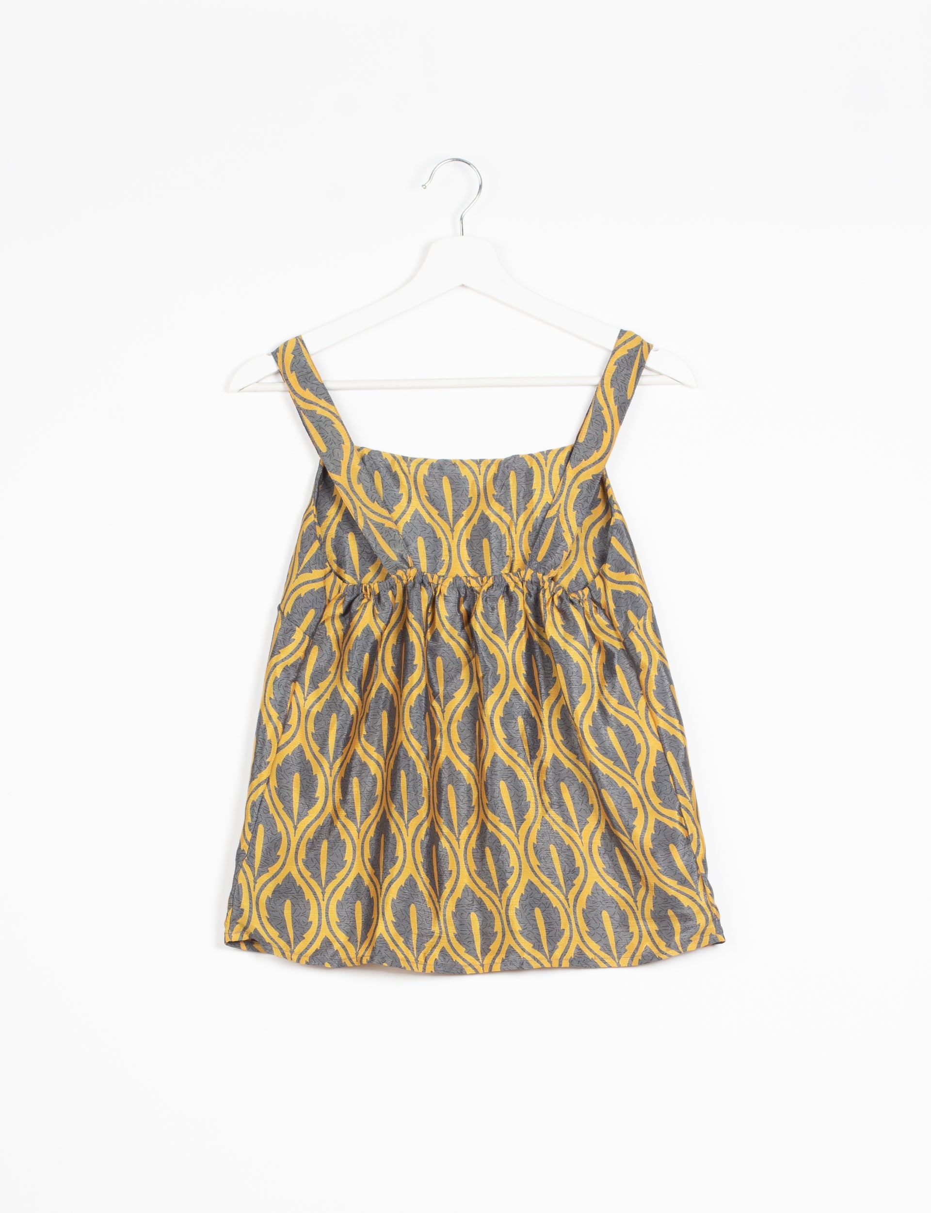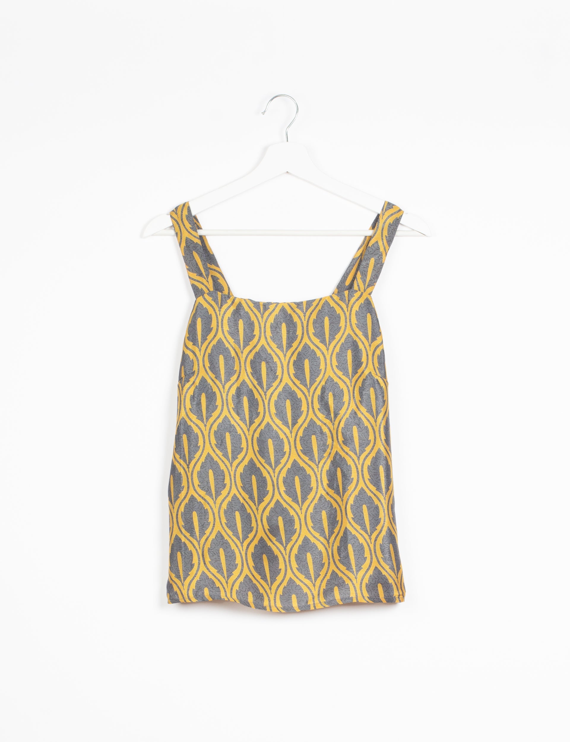 This is a sleeveless top featuring a square neckline and wide shoulder straps. The front is constructed with a clean, straight-cut bodice for a streamlined fit. The back features a gathered panel below the shoulder line, providing volume and ease through the lower body.