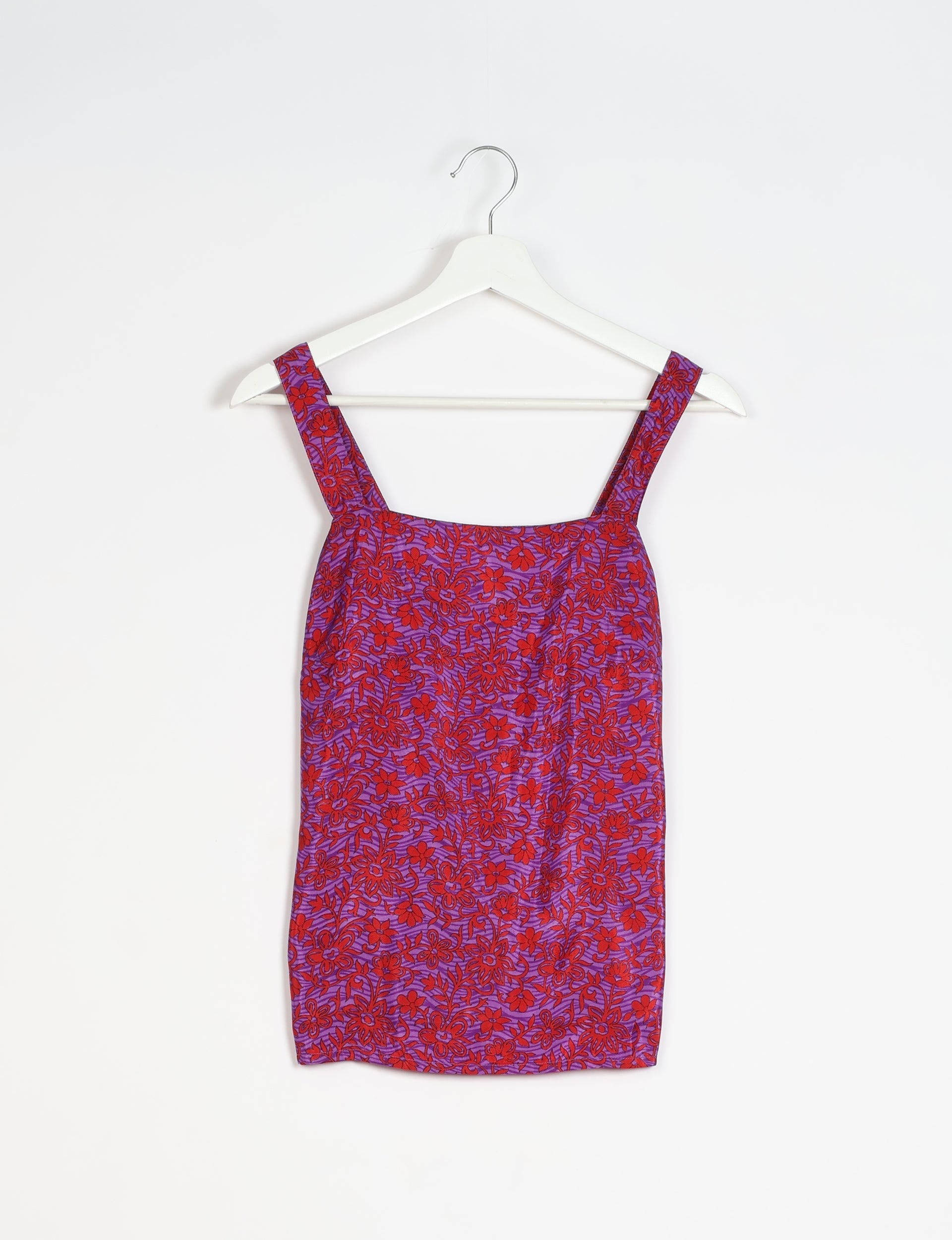 This is a sleeveless top featuring a square neckline and wide shoulder straps. The front is constructed with a clean, straight-cut bodice for a streamlined fit. The back features a gathered panel below the shoulder line, providing volume and ease through the lower body.