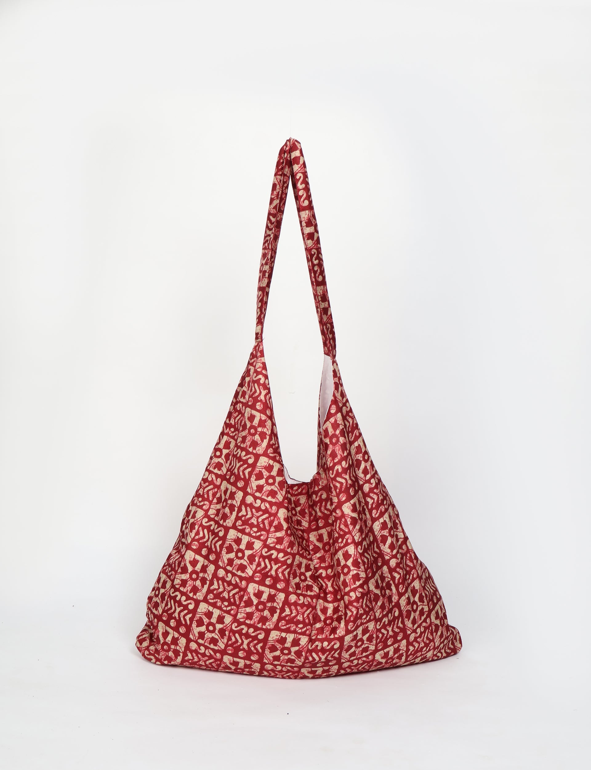 A soft-structured shoulder bag designed in a unique trapeze shape. The interior includes a small stitched pocket for secure storage. The wide top narrows toward the base, ensuring a snug fit against the body. Lighting and screens may cause slight variations in color appearance.