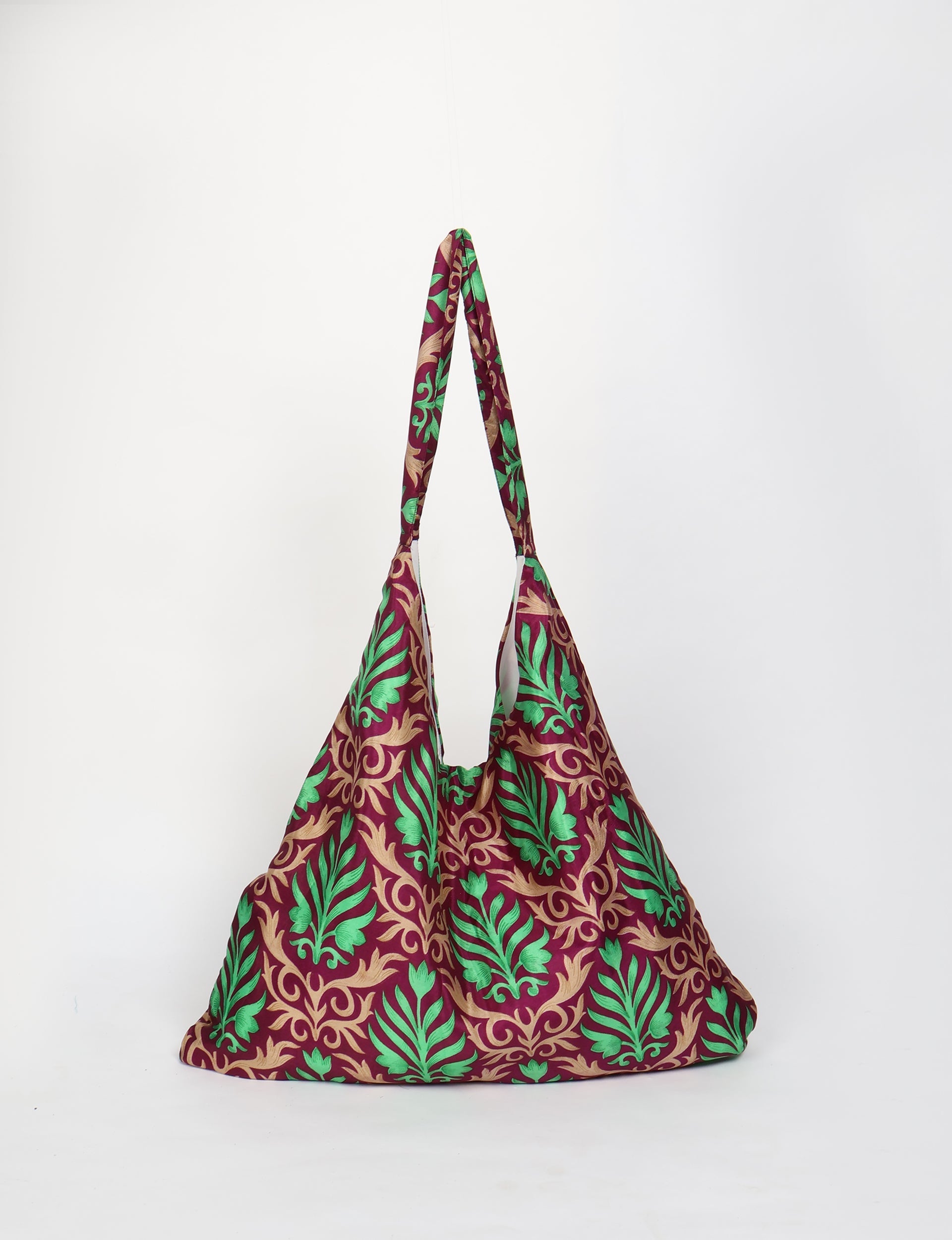 A soft-structured shoulder bag designed in a unique trapeze shape. The interior includes a small stitched pocket for secure storage. The wide top narrows toward the base, ensuring a snug fit against the body. Lighting and screens may cause slight variations in color appearance.