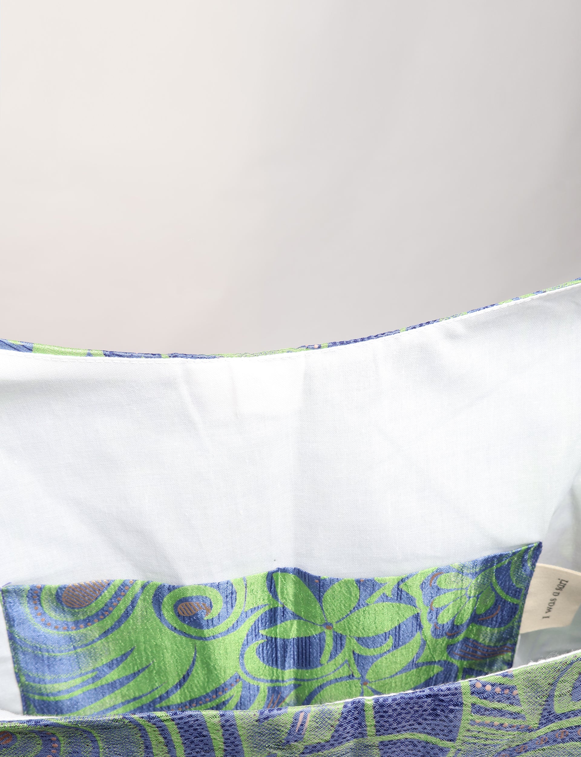 I'm not made from virgin fabrics and dyes, so my carbon footprint, pollution and water usage is way lower than other products. Instead, I'm made with circular production methods, from waste fabric which already existed. I turned into an I was a Sari instead of becoming landfill. Now I'm looking forward to my second life, maybe with you.