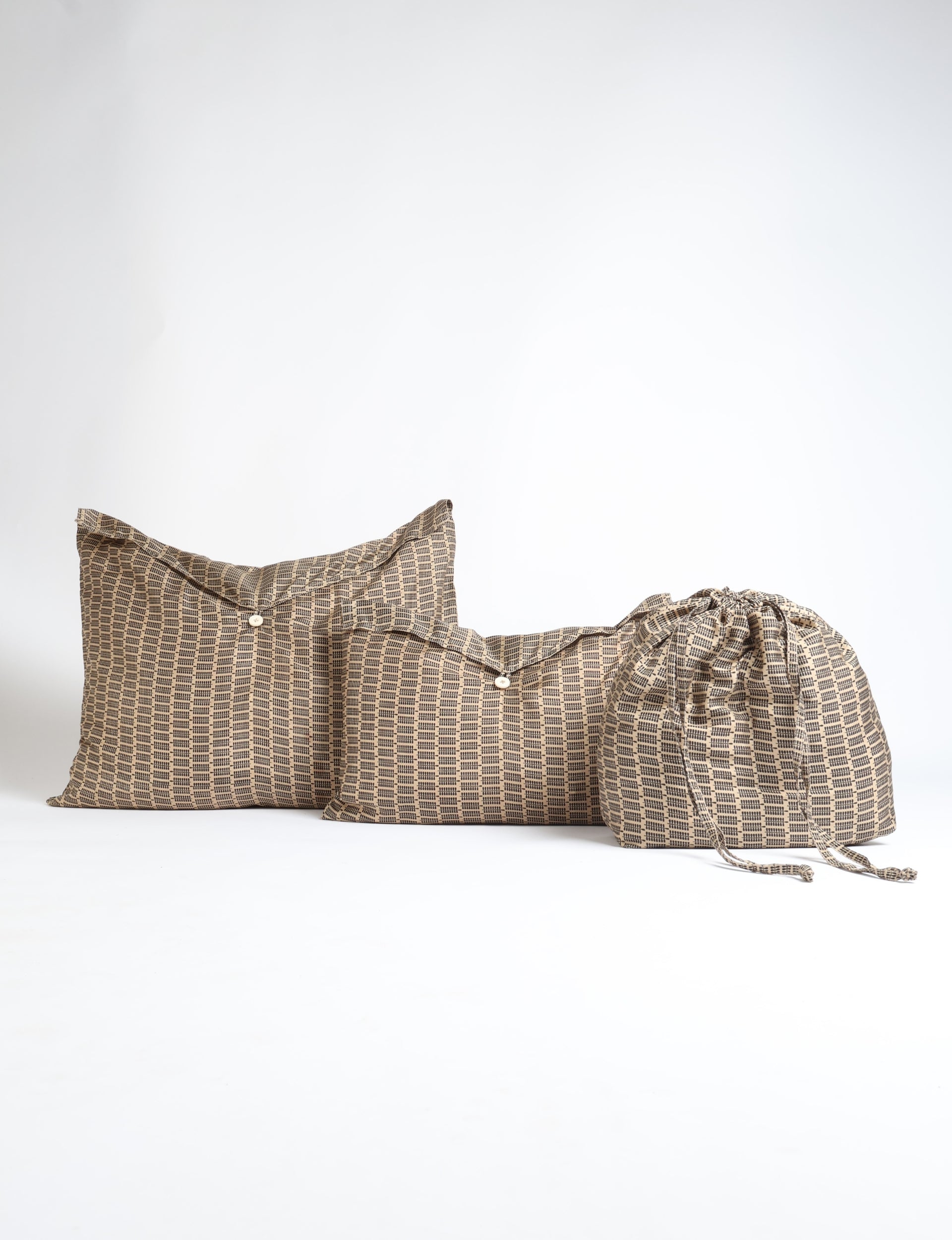 A lightweight 3-piece travel pouch featuring a foldover loop and button closure while the smallest one has a drawstrong closure. Pouches are of increasing size to nest or store flat. Lighting and screens may cause slight variations in color appearance.