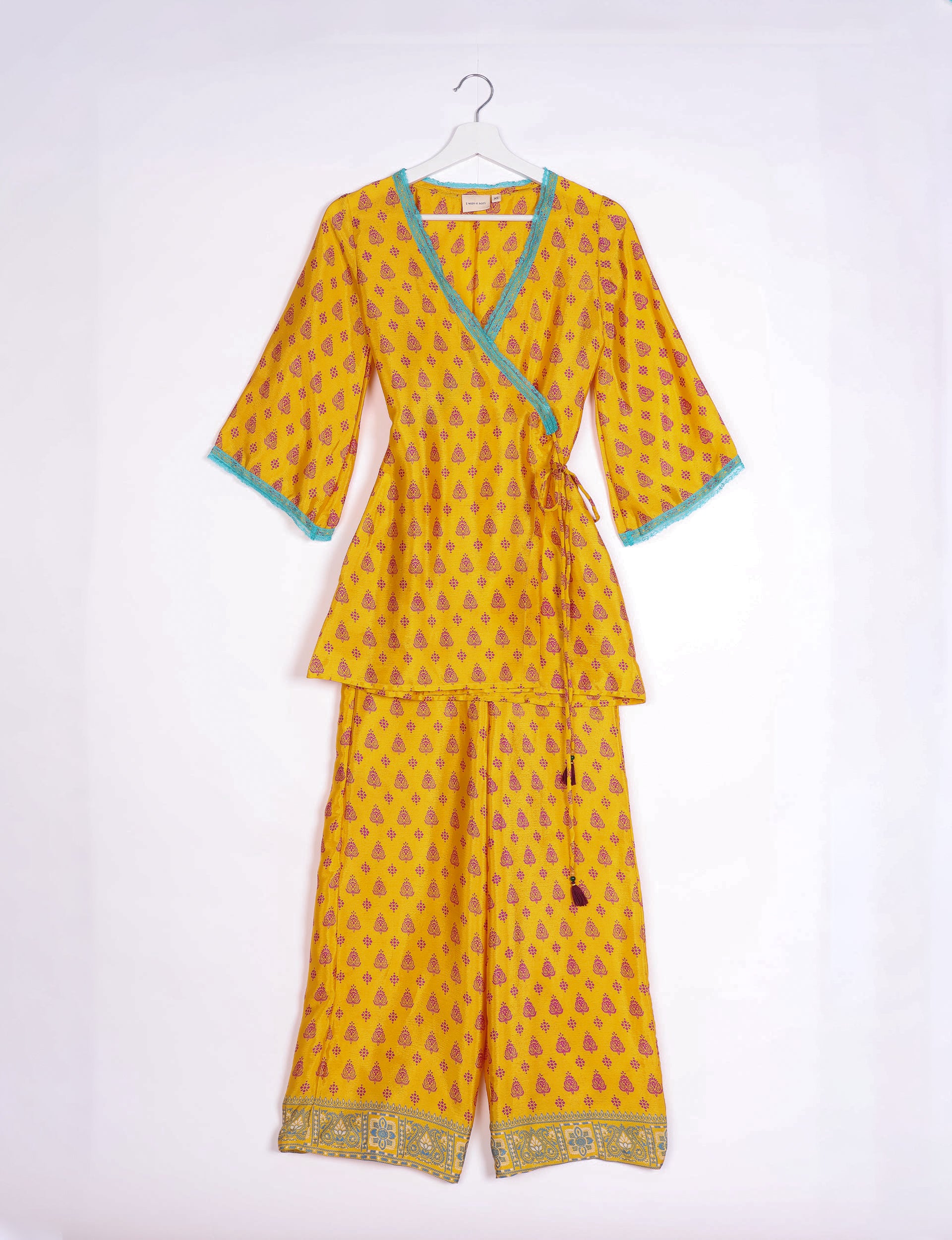 Two-piece co-ord set featuring a V-neck wrap tunic top and wide-leg pants. The top has 3/4th length sleeves and is fastened at the waist with a tie belt. The top includes a contrasting lace trim along key edges.