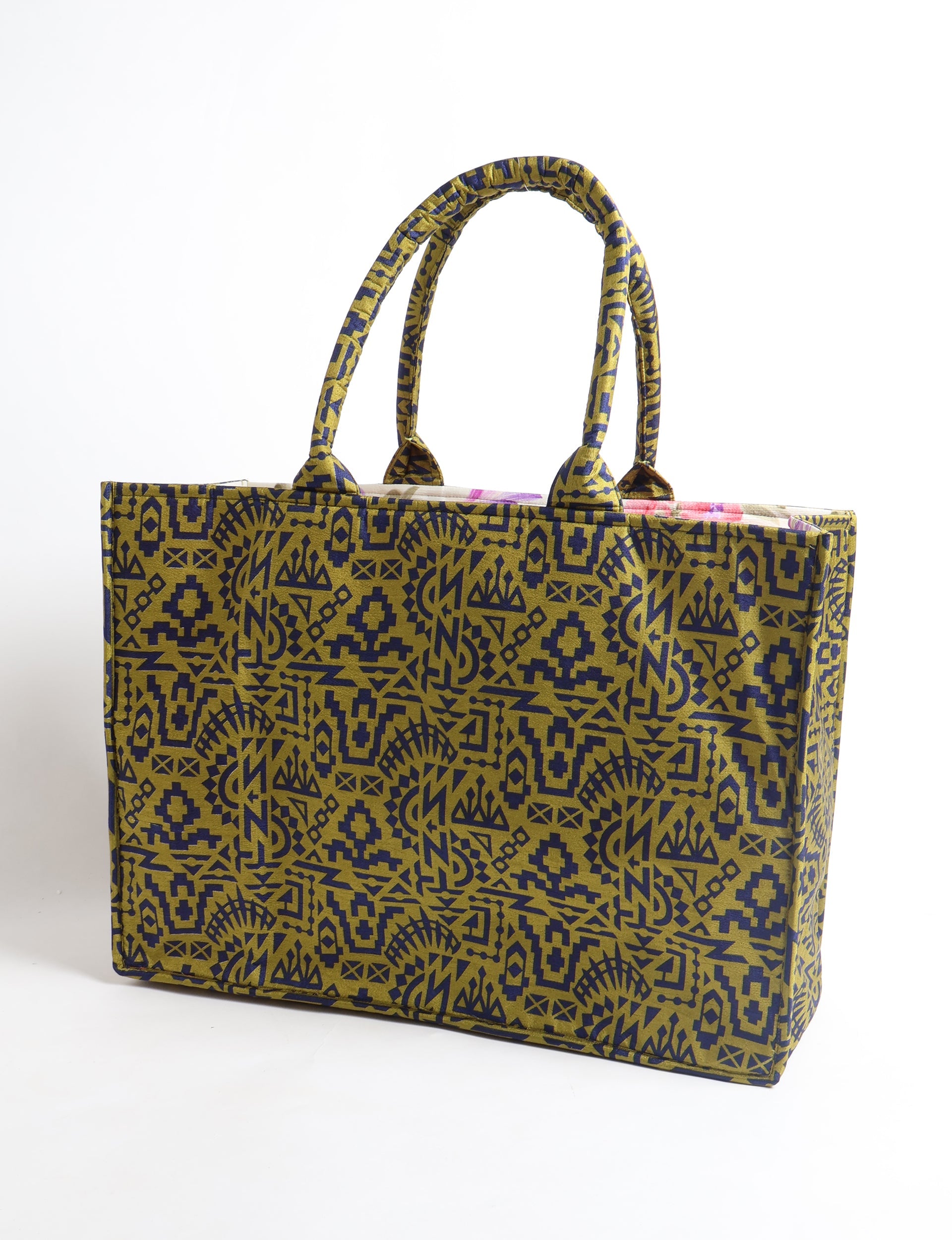 Semi-structured tote bag engineered to maintain upright posture due to reinforced base structure. Dual carry functionality via soft, padded fabric handles, suitable for shoulder or hand carry. Lined with contrast sari fabric. Internal compartment includes single zippered pocket for secure storage. Lighting and screens may cause slight variations in color appearance.