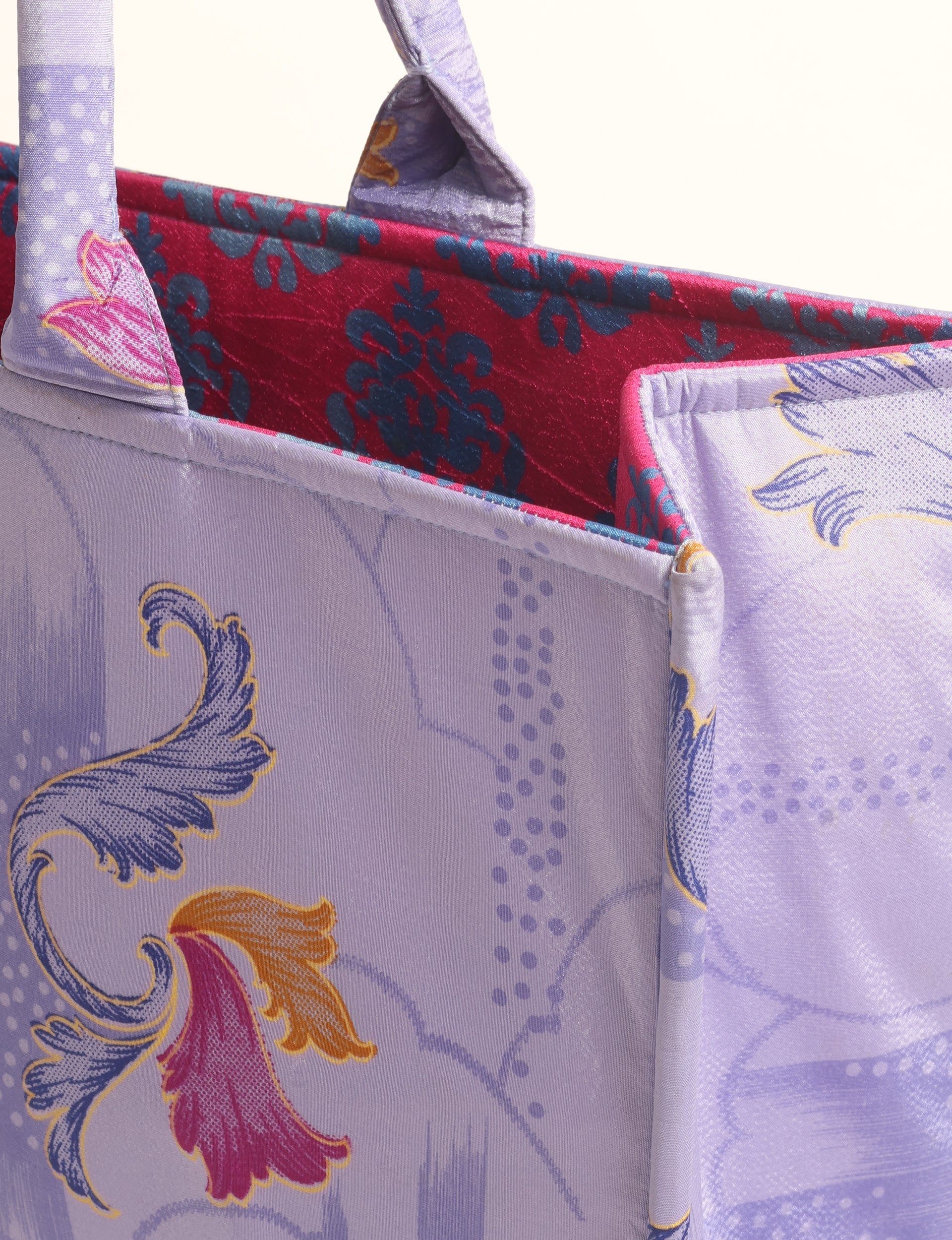 Semi-structured tote bag engineered to maintain upright posture due to reinforced base structure. Dual carry functionality via soft, padded fabric handles, suitable for shoulder or hand carry. Lined with contrast sari fabric. Internal compartment includes single zippered pocket for secure storage. Lighting and screens may cause slight variations in color appearance.