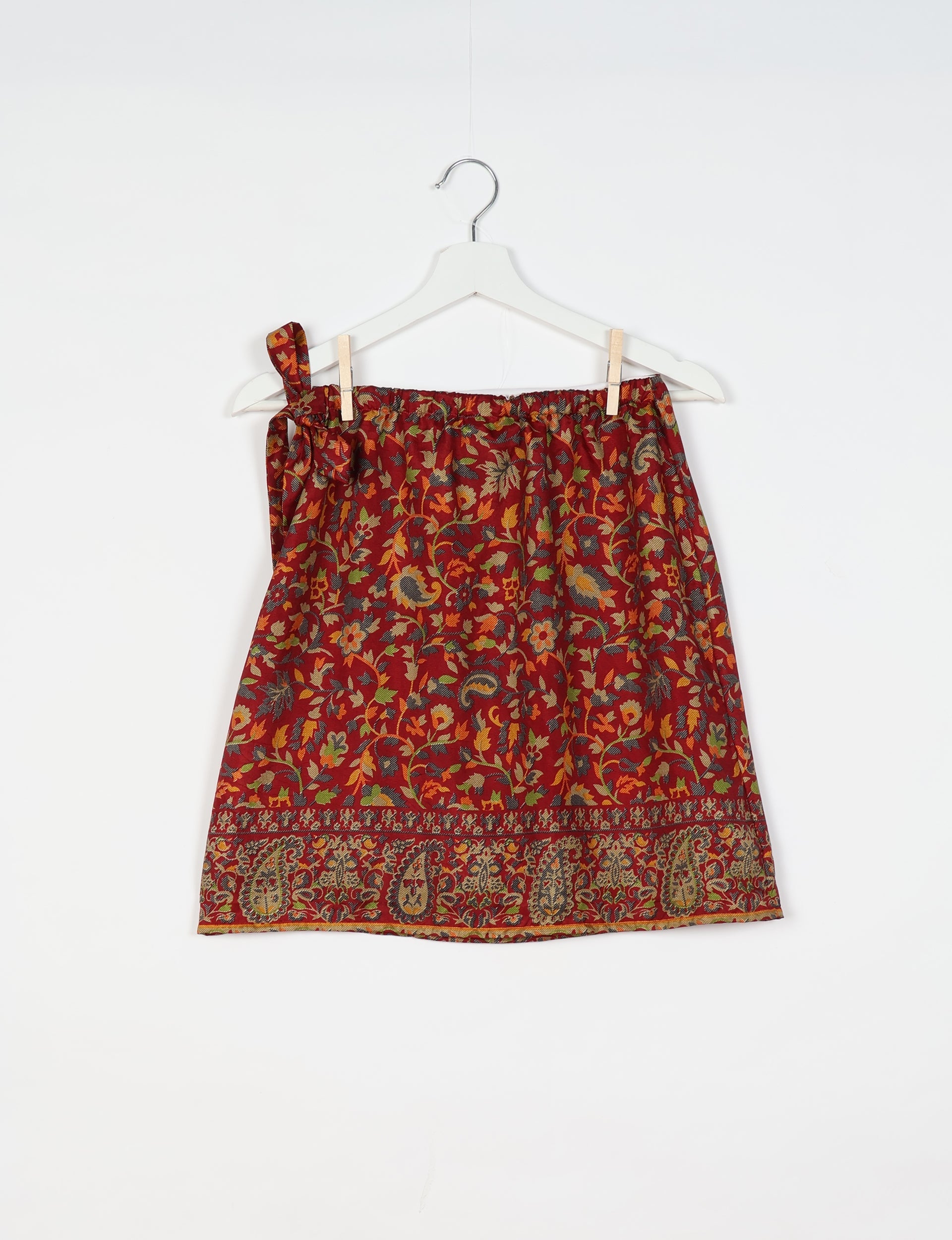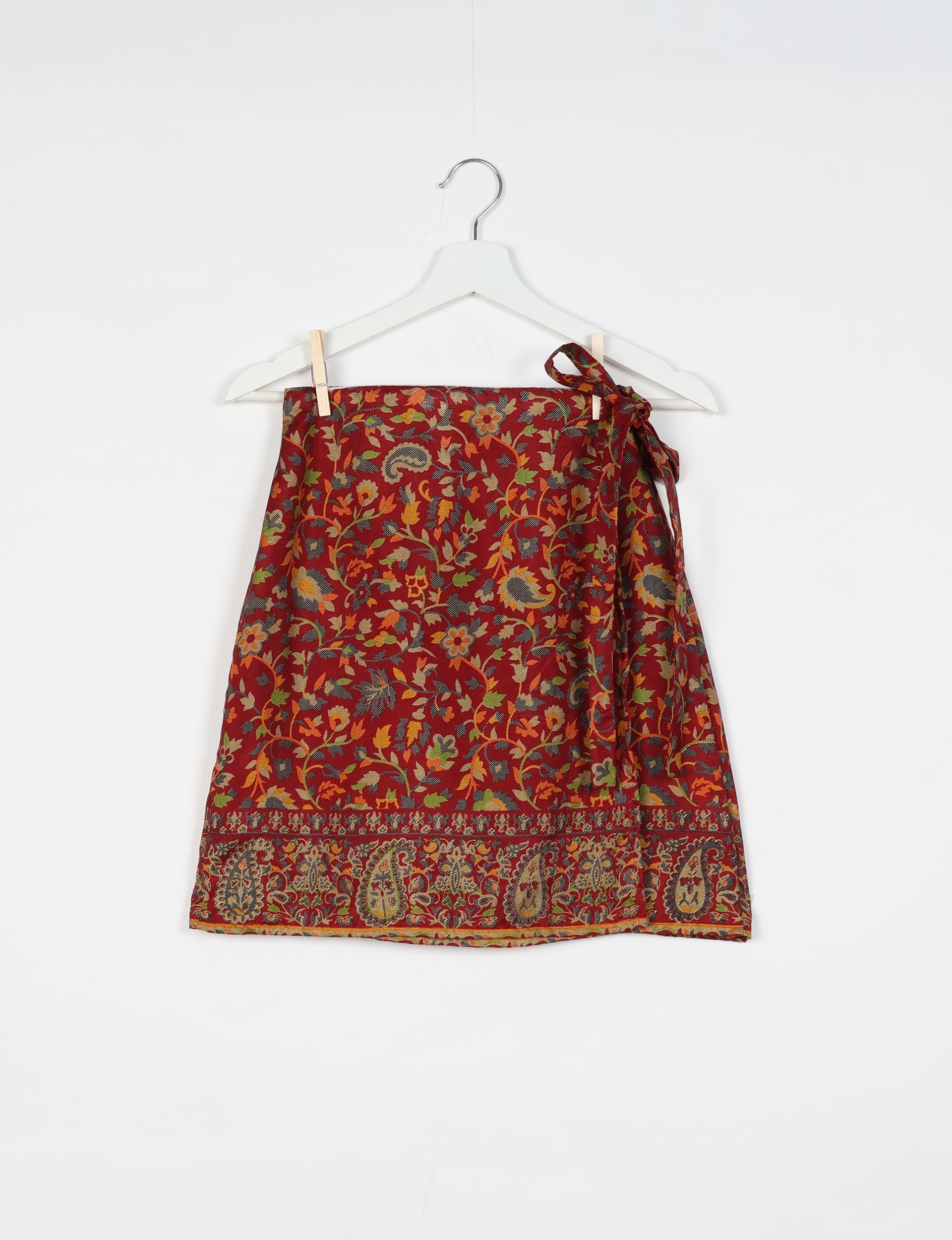 This is a mid-thigh length wrap skirt with an adjustable side tie closure. The waistband is partially elasticated at the back to accommodate varying waist sizes. It features a single overlapping front panel that wraps and ties at the side.